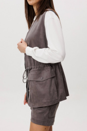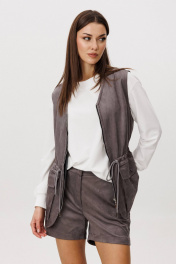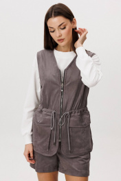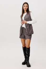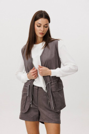 Замша уже несколько сезонов подряд удерживает статус одного из главных трендов. Для тех кто следит за модными новостями, это неудивительно: эта благородная фактура стала основой большинства модных дизайнерских коллекций. Эффектная, она органично вписывается в самые разные образы. Образ, который говорит сам за себя, смелый и дерзкий, и в то же время очень комфортный. Нестандартный жилет с накладными карманами-пеналами с клапаном. Регулирующая кулиса, подчеркивающая талию. Свободный силуэт, центральная застежка на тесьму молнию, фигурная линия низа. Жилет на подкладке. Свитшот свободный, с заниженной линией плеча, регулирующей кулисой с фиксаторами по низу изделия, притачными манжетами по низу рукава из отделочного полотна, горловина изделия также выполнена из этого материала. Шорты-это просто ""masthave"" осеннего сезона, с лоферами или казаками, с модными сапогами трубами, с носками или гольфами-это всегда эффектно подчеркивает вашу свободу, независимость и индивидуальность. Шорты на притачном поясе со шлевками, эластичном в области спинки. Передние половинки-с наклонным боковым карманом. Задние-с отрезной кокеткой и накладным большим карманом. Длина свитшота около 62 см. Длина рукава около 62 см. Длина жилета около 67 см. Длина шорт около 35 см.