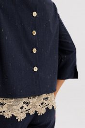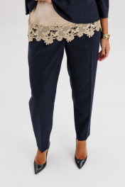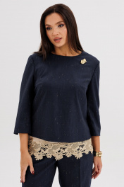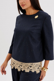 Утончённый и женственный костюм, созданный для особых случаев и стильных будней. Мягкое мерцание люрексовой нити в поливискозной ткани придаёт образу изысканное сияние, а продуманный крой обеспечивает идеальную посадку и комфорт. Главный акцент комплекта — нижний атласный топ с роскошной кружевной отделкой, создающий эффект многослойности и добавляющий наряду нотку романтичности. Верхняя блуза с рукавом ¾ лаконична и элегантна, а прямые брюки визуально вытягивают силуэт, делая образ стройнее и гармоничнее. Такой ансамбль станет отличным выбором для торжеств, встреч и особых случаев, когда хочется подчеркнуть вкус и женственность. Современная классика в лучших традициях элегантного стиля.