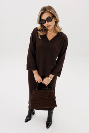 Модный ""must have"" осенне-зимнего сезона - трикотажный костюм с длинной юбкой, и эта длина - максимальна. В тандеме со слегка укороченным верхом простота и элегантность выходят на максимальный уровень. Свободный упрямлённый джемпер с заниженной линией плеча, V-образным вырезом и рукавом длиной 7/8. По горловине и низкам рукавов - отделочные полоски. Юбка макси, на притачном эластичном поясе с большими накладными карманами на переднем полотнище. Заднее полотнище с центральным швом, шлицей, талиевыми вытачками и застёжкой. Длина джемпера около 60 см, длина рукава с плечом около 68 см. Длина юбки около 90 см