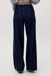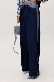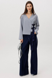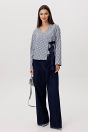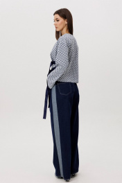 Современный брючный комплект, в котором гармонично сочетаются комфорт трикотажа и выразительность денима. Идеальное решение для повседневного гардероба в стиле smart casual. Джемпер выполнен из мягкого трикотажного полотна. Лёгкая фактура и свободный крой обеспечивают комфортную посадку и свободу движений. V-образный вырез визуально вытягивает силуэт, а лаконичный геометричный принт добавляет образу динамики и актуальности. Брюки — широкие джинсовые с высокой посадкой. Плотный деним хорошо держит форму, формируя выразительный силуэт. Расширенный крой от бедра создаёт эффект удлинённых ног и придаёт образу современный характер. Преимущества комплекта: Комфортный трикотаж, приятный к телу Актуальный широкий крой брюк Универсальное сочетание принта и классического денима Возможность носить элементы комплекта отдельно Комплект легко адаптируется под разные стилистические задачи: сочетайте его с кроссовками для повседневных образов или добавьте обувь на каблуке для более собранного и выразительного аутфита. Практичность, комфорт и актуальный силуэт — идеальный баланс для современног