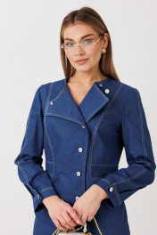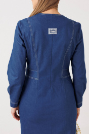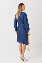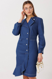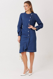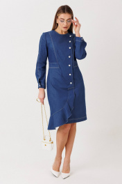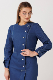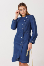Эффектное платье полуприлегающего силуэта подчёркивает женственные линии фигуры и создаёт утончённый, собранный образ. Модель выполнена из качественного денима с чёткой формой и аккуратной отделкой контрастной строчкой. Особенности модели: смещённая застёжка на пуговицы — современный акцент и визуальное удлинение силуэта; акцентированная линия талии, формирующая изящный силуэт «песочные часы»; продуманный крой с рельефными линиями для идеальной посадки; асимметричный нижний край с мягкой волановой деталью, добавляющей динамику образу; лаконичная круглая горловина и длинный рукав для баланса строгости и женственности. Платье легко адаптируется под разные сценарии: с лодочками — для деловых и торжественных выходов, с более расслабленной обувью — для стильного городского образа. Идеальный выбор для тех, кто ценит архитектурный крой, акцентные детали и современную классику.