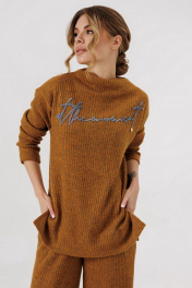 Комплект состоит из джемпера и брюк. Джемпер свободного силуэта, с дизайнерской объемной вышивкой по полочке и разрезами в боковых швах. Брюки широкие, на резинке, с карманами.