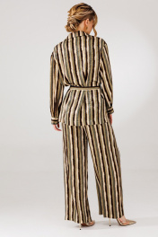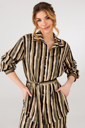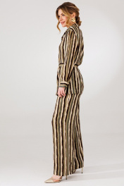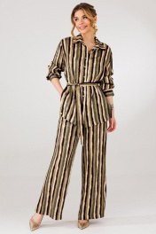 Вырез горловины: воротник рубашечного типа Дополнительное описание: комплект свободного силуэта, блуза с центральной застежкой на петли и пуговицы. Брюки по поясу на резинке, с карманами в боковых швах. В комплект входит пояс.