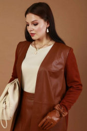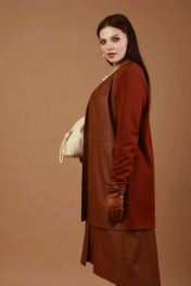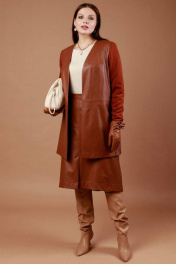 Достойная альтернатива жакету-кардиган, особенно комфортная комбинированная модель из экокожи и трикотажа. Прямого силуэта. Длина ниже уровня бедер. По переду изделия расположены горизонтальные подрезы. Вырез горловины V - образный. Застежка встык. Рукав втачной, длинный. Низ рукав заужен. Кардиган – это модный, универсальный и очень удобный элемент современного гардероба.