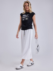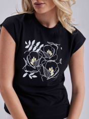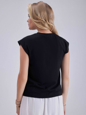 Эффектный дизайнерский базовый женский джемпер.Модель имеет универсальный прямой силуэт, подходящий для любых обладательниц этой модели,поскольку не стесняет движений. Закрывает плечи но при этом обеспечивает комфорт в движении, короткий рукав.Один из главных элементов модного образа, который обязательно должен быть в любом летнем женском гардеробе.Благодаря однотонному черному оттенку легко комбинируется с другими цветами,может использоваться фоном для более ярких оттенков,является прекрасной незаменимой базой,изящно выравнивает любой силуэт. По переду проходит разработанная дизайнерами печать в качестве изящных крупных контрастных вариаций цветов,привлекающих к себе внимание,задающих определенное настроение и способных даже влиять на человеческие эмоции. Стильный оригинальный, но не принужденный, вполне достойный летний вариант.
