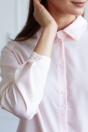 Блузка рубашечного кроя свободного силуэта длиной ниже линии бедер. Спереди застежка на пуговицы.Рукав длинный, рубашечный с манжетой по низу шириной 4 см и застежкой на пуговицу. Воротник стояче-отложной. Легкая струящаяся блуза станет приятным дополнением вашего офисного или повседневного лука.