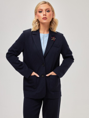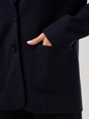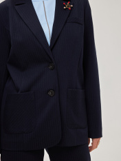 Элегантный классический двубортный женский жакет, выполненный преимущественно из дышащей импортной качественной вискозы, что является особым преимуществом при выборе данной модели. В виде минималистичного украшения в данном изделии представлены накладные карманы и фурнитура в виде больших пуговиц черного цвета. Выполнен в темно-синих оттенках, в качестве принта, добавлена ненавязчивая лаконичная светлая полоска, классический принт, который никогда не выходит из моды. Все эти составляющие позволяют добавлять разные цветовые решения, создавать монохромные образы, либо создавать цветовой диссонанс. Прямой и удлиненный крой позволяет чувствовать себя комфортно абсолютно в любой ситуации. Подходит для создания более деловых образов и для повседневной жизни. Присутствие бортов позволяет продемонстрировать красивое декольте и при создание более романтических образов. Демисезонен, поэтому можно носить данное изделие абсолютно в любое время года, что является особенным преимуществом при выборе
