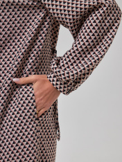 Женское платье-рубашка расширенного книзу силуэта длиной до середины икры. Универсальное, женское платье идеально подойдет как: на работу, в офис или для повседневной носки. Застегивается платье на пуговицы, а сзади имеется кулиса со шнурком. Воротник рубашечного типа. Рукава длинные со спущенным присобраны на резинку шириной 3 см. Данная модель платья обязательно должна быть в гардеробе девушки, предпочитающей стиль, удобство и женственность в любое время года.