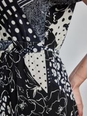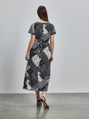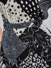 Платье расширенное книзу, дина миди. Подчеркнуть талию позволяет кулиса, расположенная чуть выше талии. Рукав кимоно с расширением по низу. Круглый вырез горловины. Без подкладки. Летящий силуэт с ярким принтом позволяют создать лаконичный образ для всех случаев жизни.