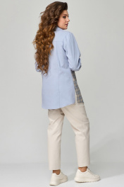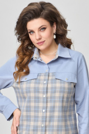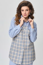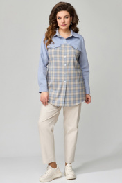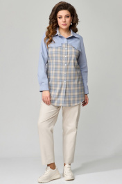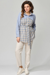 Комплект (рубашка и джинсовые брюки) "АЛЬДОНА" спортивного стиля, прямого силуэта. с поясом. Рубашка без подкладки, состоит из двух тканей: однотонная - джинс "Тифани" + отделка "Клетка поливискоза". На полочке кокетка, в шве кокетки - клапан. В рубашке воротник рубашечного типа на стойке, застежка на кнопки. По спинке рубашки - рельефы и кокетка, в боковых швах - разрезики. Рукав двухшовный, низ рукава обработан манжетой на застежку. Джинсы - брюки, зауженные к низу, с застежкой на молнию и пуговицы, в боковом шве - карман, по спинке пояса - резинка. Брюки со стандартной посадкой (средней).