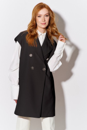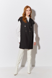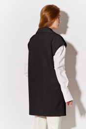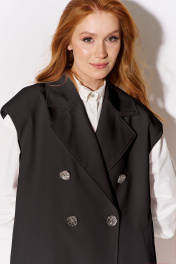 Жилет прямого кроя. Характеристики: выполнен из костюмной ткани в черном цвете, двубортная застежка на петли и пуговицы, жилет на подкладке, функциональные карманы с листочкой. Длина жакета по переду 89,5 см.