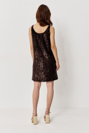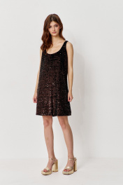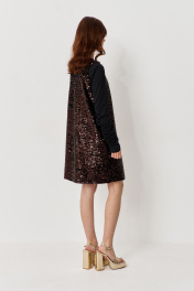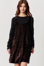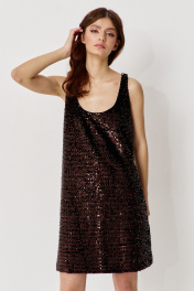 Сарафан прямого силуэта на подкладке. Характеристики: выполнен из паеточной ткани в коричневом цвете. Длина по переду 88 см.