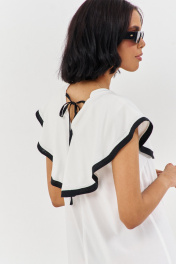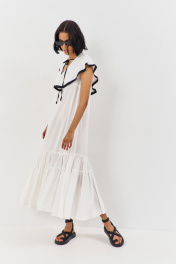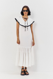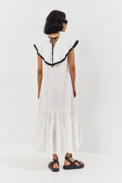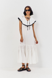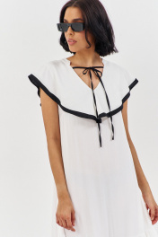 Платье свободного силуэта. Характеристики: выполнено из плательной ткани в белом цвете с черной отделкой по волану горловины, по горловине переда и спинки декоративные завязки. Длина платья 140 см.