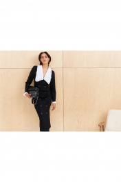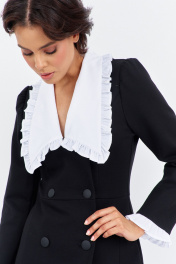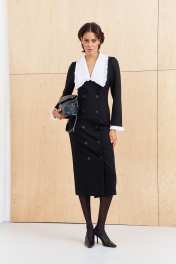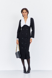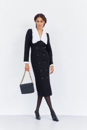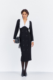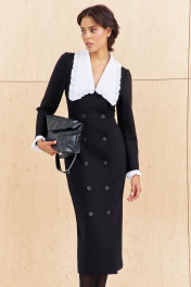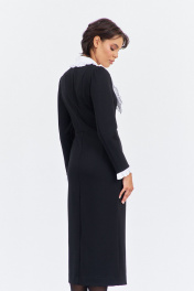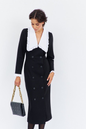 Платье приталенного силуэта со смещенной застежкой. Характеристики: выполнено из плательной ткани в черном цвете, воротник отложной отстегивающийся в белом цвете, застежка-смещенная на петли и пуговицы, по рукаву отстегивающиеся манжеты в белом цвете. Длина платья 124 см, длина рукава 62 см.