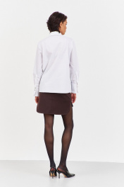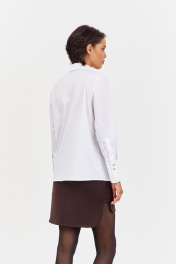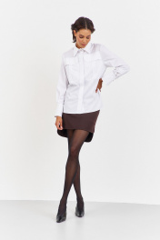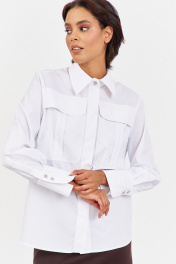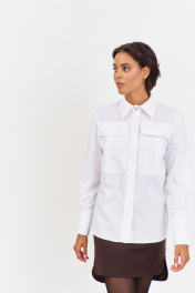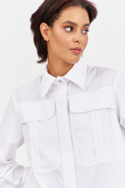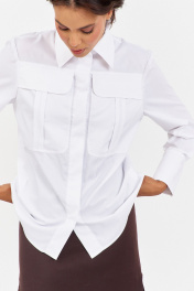 Рубашка приталенного кроя с декоративными карманами по переду. Характеристики: выполнена из блузочной ткани в белом цвете, по переду обработаны декоративные карманы, центральная застежка на петли и пуговицы, по низу рукавов манжеты с декоративными углами. Длина рубашки по переду 68,5 см, длина рукава 60,5 см.