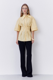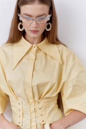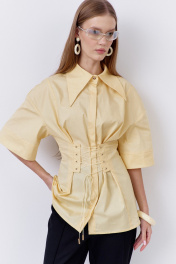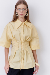 Блузка приталенного силуэта с декоративной шнуровкой по переду и спинке. Характеристики: выполнена из блузочной ткани в желтом цвете, центральная застежка на петли и пуговицы, по переду и спинке декоративная шнуровка, воротник рубашечного типа, спущенное плечо.
