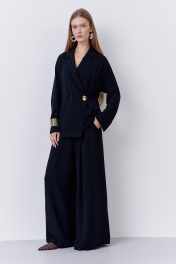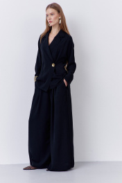 Брюки-палаццо свободного силуэта. Выполнены из костюмно-плательной ткани в черном цвете. Пояс брюк на резинке, в боковых швах карманы.