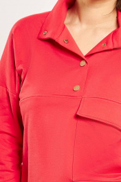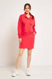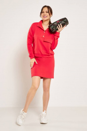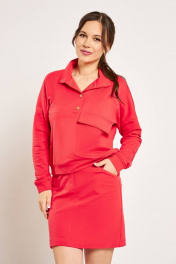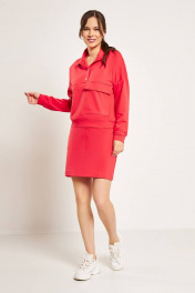 Костюм женский в спортивном стиле из легкой хлопковой ткани (футер, класс пенье). Джемпер прямого силуэта. По переду отрезная кокетка с функциональным настрочным карманом, застежка на кнопки, переходящие в воротник- стойку. Низ джемпера на притачной планке. Рукава спущенные, низ на притачной манжете. Юбка полуприлегающего силуэта, по переду функциональные карманы. Пояс отрезной с эластичной тесьмой , имитация молнии.