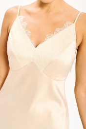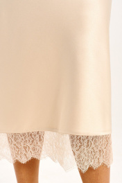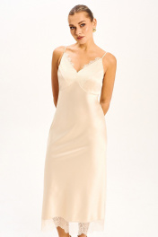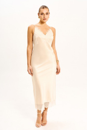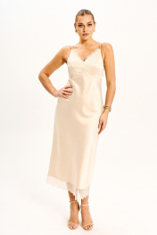 Платье - миди прилегающего силуэта выполнено из струящегося шелк - сатина на регулируемых бретелях и молнией в боковом шве. Подрезы по линии груди и низу платья дополнены мягким французким кружевом, которое держит форму. Платье полностью соответствует заявленному размеру. Пожалуйста, пользуйтесь таблицей замеров готового изделия, чтобы подобрать идеальный размер. Уход за платьем: - при стирке в стиральной машине выбрать бережный либо деликатный режим; -температура воды не выше 30 градусов. ( платье прошло тестовую стирку не линяет).