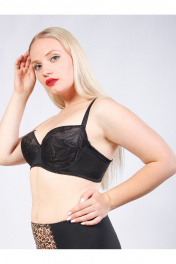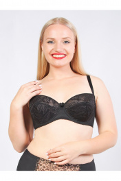 Бюстгальтер кружевной балконет на каркасах, больших размеров. Крой бюстгальтера выполнен с учетом особенностей груди большого размера. Чашка мягкая, с хлопковой подкладкой без уплотнения. Стан (бочок) выполнен из функционального трикотажного полотна, чашка из кружевного полотна. Т-образный шов чашки приподнимает и округляет грудь. U-образное расположение бретелей. Бретели из эластичной ленты с регулировкой по длине. Застёжка сзади на крючки и петли, 2*3 крючка. Декоративный элемент – бант на ластовице.