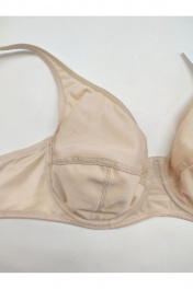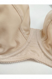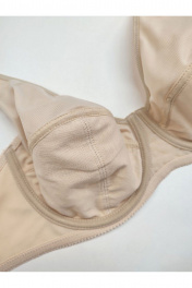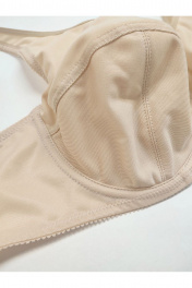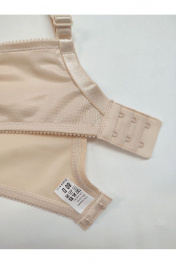 Бюстгальтер гладкий с мягкой чашкой на каркасах, больших размеров. Изготовлен из трикотажного полотна. Чашка высокая закрытая, с дополнительными поддерживающими деталями по бокам. Бретели широкие усиленные вставками из функционального полотна. Края верха чашки обработаны окантовкой. Верхняя часть чашки однослойная, нижняя часть двухслойная с подкладкой их хлопка. Чашка с Т-образным швом приподнимает, округляет и поддерживает грудь большого размера. U-образное расположение бретелей. Бретели из эластичной ленты с регулировкой по длине. Застёжка сзади на крючки и петли, 2*3 крючка.