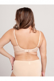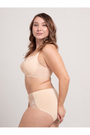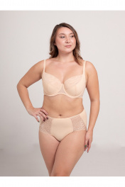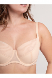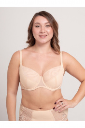Бюстгальтер из сетки и микрофибры. Бюстгальтер на каркасах большой размерной группы. Крой бюстгальтера выполнен с учетом особенностей груди большого размера. Бюстгальтер с комбинированной чашкой - снизу гигроскопичная подкладка из поролона на хлопковой подкладке, верх прозрачное сетчатое полотно в подгибку без обработки края. Горизонтальный т-образный шов чашки поддерживает и приподнимает грудь. Стан из сетчатого полотна. U-образное расположение бретелей с регулировкой по длине. Застёжка крючки 2*3.