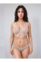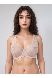 Бюстгальтер прозрачный с мягкой чашкой на каркасах, больших размеров. Изготовлен из сетчатого полотна. Чашка высокая закрытая, с дополнительными поддерживающими деталями по бокам. Бретели широкие усиленные вставками из функциональной сетки. Бюстгальтер выполнен из прозрачного сетчатого полотна, края верха чашки обработаны окантовкой, декоративный бант на ластовице. Верхняя часть чашки однослойная (из прозрачной сетки), нижняя часть двухслойная. Чашка с Т-образным швом приподнимает, округляет и поддерживает грудь большого размера. U-образное расположение бретелей. Бретели из эластичной ленты с регулировкой по длине. Застёжка сзади на крючки и петли, 2*3 крючка.