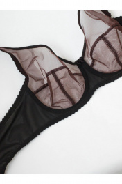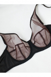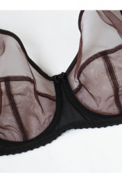 Бюстгальтер прозрачный с мягкой чашкой на каркасах, больших размеров. Изготовлен из сетчатого полотна. Чашка высокая закрытая, с дополнительными поддерживающими деталями по бокам. Бретели широкие усиленные вставками из функциональной сетки. Бюстгальтер выполнен из прозрачного сетчатого полотна, края верха чашки обработаны окантовкой, декоративный бант на ластовице. Верхняя часть чашки однослойная (из прозрачной сетки), нижняя часть двухслойная. Чашка с Т-образным швом приподнимает, округляет и поддерживает грудь большого размера. U-образное расположение бретелей. Бретели из эластичной ленты с регулировкой по длине. Застёжка сзади на крючки и петли, 2*3 крючка.