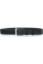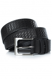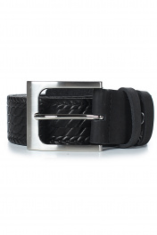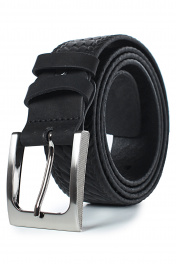 Ремень в обрезку, с обработкой краев, без обстрочки ремня по периметру, с пряжкой и шлевкой на запряжнике, с одной передвижной шлевкой, с тиснением. Цвет фурнитуры-никель. Размеры: 1350x3x40