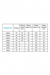 Костюм 2-х предметный. Жакет на подкладке, с застежкой на петли-пуговицы. Отрезная баска по линии талии. Нагрудный карман с декоративным платочком, не функциональный. Рукав втачной 3/4, в локтевом шве шлица с пуговицами. Юбка на подкладке, зауженного к низу силуэта. Верхний край юбки на высоком поясе. Потайная молния и шлица в среднем шве заднего полотнища. Ремень входит в комплект (цвет и дизайн может отличаться от фото). длина жакета- 56см, длина рукава- 43см, длина юбки- 65см