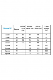 Комплект 2-х предметный. Жакет укороченный, прямого силуэта, на подкладке. Двубортный, на четыре пуговицы. Без карманов, с декоративными клапанами. Брюки широкие, с карманами, верх брюк на широкой резинке. длина жакета-48см, длина рукава-26см, длина брюк по боковому шву-112см, длина по шаговому шву-80см
