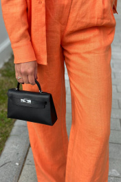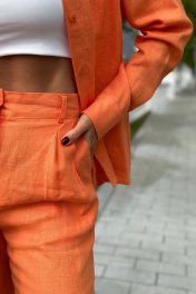 Брюки-палаццо прямого кроя сочного оранжевого оттенка из 100% умягченного дышащего льна. Свободный силуэт, средняя посадка, широкий пояс на пуговице в тон. Сочетайте с легкими топами, яркой блузкой в тон (арт.10003005.059), или классической белой (арт.10003005.032) и получаайте незабываемые яркие летние образы.