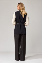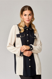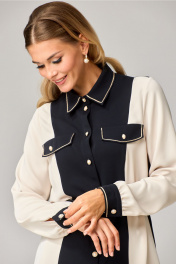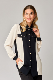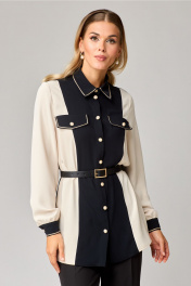 Блузка прямого силуэта из плательной ткани 2-х цветов. По переду центральная застежка. Воротник со стойкой. Перед с рельефами и декоративными клапанами. Рукав втачной одношовный. Низ рукава собран на манжету с застежкой на петлю и пуговицу. По клапану, воротнику и манжете настрочена отделочная тесьма. Спинка, манжеты, воротник, внутренние части переда выполнены из ткани черного цвета. К блузке прилагается ремень из кожзама с металлической пряжкой. Длина блузки: 73 см, длина рукава: 61 см.