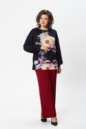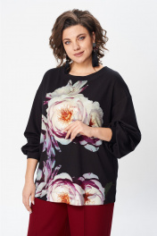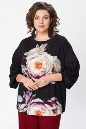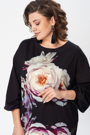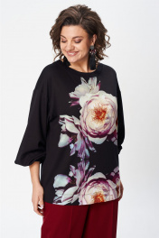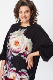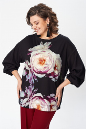 Джемпер свободного силуэта из трикотажной ткани с принтом. Рукав втачной одношовный со складками по низу и манжетой. Горловина лодочкой обработана планкой. В боковых швах по низу разрезики. Длина джемпера - 68 см, длина рукава джемпера - 53 см.