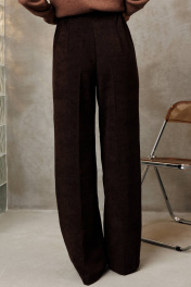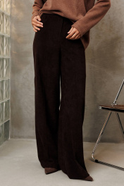 Брюки палаццо с притачным поясом из мягкой вельветовой ткани. Спереди застежка гульфик на молнии и петлей и пуговицей по поясу. По задней частям брюк вытачки. Пояс с резинкой в боковых частях. Брюки с заутюженными стрелками. Длина брюк с учетом пояса - 109 см.