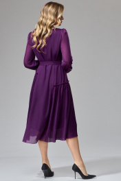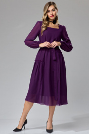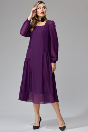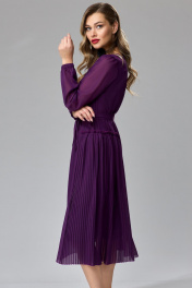 Платье А-силуэта из шифона со вставками из плиссе. Перед с рельефами. Вырез горловины квадратной формы. Спинка с рельефами. По боковым частям между рельефами вставлены детали из плиссе разной величины по высоте. Рукав втачной со сборкой по окату, низ рукава собран на резинку. К платью прилагается пояс из основной ткани. Платье на подкладке. Длина платья - 114 см, длина рукава - 62 см.