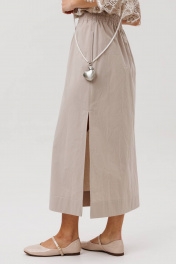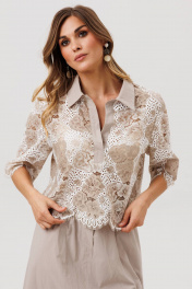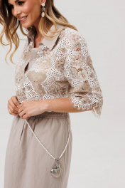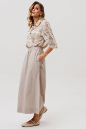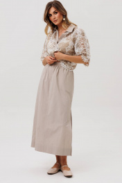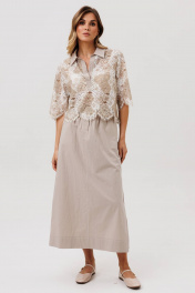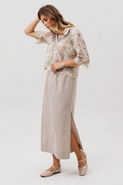 Костюм состоит из блузки и юбки. Блузка прямого силуэта с воротником поло из легкого кружева. Воротник и планка выполнены из отделочной ткани. Рукав втачной одношовный. Юбка А-образного силуэта на резинке по талии из легкой летней хлопковой ткани. Спереди средний шов и имитация гульфика в нем. В боковых швах карманы, слева разрез. Спинка со средним швом. Все швы отстрочены декоративными строчками. Длина блузки - 53 см, длина рукава блузки - 35 см, длина юбкис учетом пояса - 88 см.
