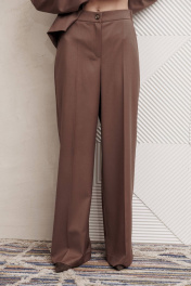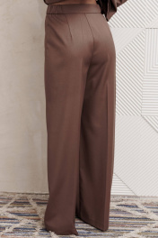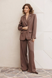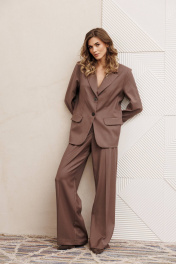 Костюм состоит из жакета и брюк из костюмной вискозной ткани цвета капучино. Жакет полуприлегающего силуэта. Застежка однобортная на две пуговицы, воротник пиджачного типа. Перед с талиевой вытачкой, рельефом и декоративным клапаном. Спинка с рельефами из проймы и средним швом. Рукав втачной двухшовный. Жакет на подкладке. Брюки палаццо с притачным поясом. Спереди застежка гульфик на молнии и петлей и пуговицей по поясу. По задней частям брюк вытачки. Пояс с резинкой в боковых частях. Брюки с заутюженными стрелками. Длина жакета - 68 см, длина рукава жакета - 60 см. Длина брюк с учетом пояса - 109 см.