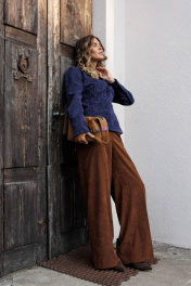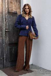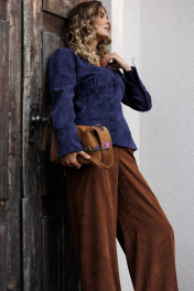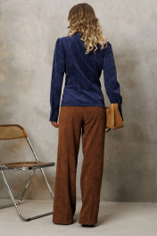 Костюм состоит из блузки и брюк. Блузка оригинальная приталенного силуэта из вельветовой ткани. Перед с подрезом под грудью, сборкой в районе груди и талиевыми вытачками. Затсежка на петли и пуговицы. Горловина V-образной формы. Спинка с талиевыми вытачками. Рукав втачной со сборкой по окату и с манжетой по низу. Манжета высокая с двумя петлями и пуговицами. Длина блузки - 63 см, длина рукава блузки - 64 см. Брюки палаццо с притачным поясом из мягкой вельветовой ткани. Спереди застежка гульфик на молнии и петлей и пуговицей по поясу. По задней частям брюк вытачки. Пояс с резинкой в боковых частях. Брюки с заутюженными стрелками. Длина брюк с учетом пояса - 109 см.