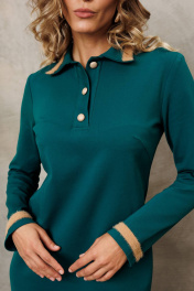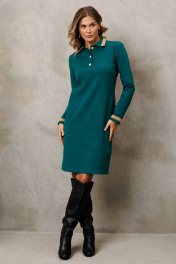 Платье слегка приталенного силуэта из плотного трикотажного полотна. Перед с застежкой поло и нагрудными вытачками. По воротнику и низу рукава настрочена декоративная тесьма. Длина платья 96 - см, длина рукава - 61 см.