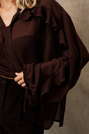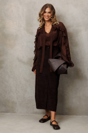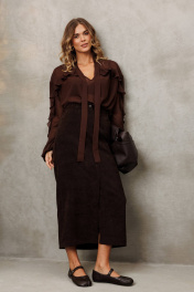 Костюм состоит из блузки и юбки. Блузка свободного силуэта из струящейся шифоновой ткани. Перед и спинка с кокеткой и сборкой. Рукав спущенный свободный с резинкой понизу. Вдоль линии кокетки и рукава вставлена рюша. Горловина V-образной формы с воротником стойкой переходящей в бант. Длина блузки - 67 см, длина рукава - 60 см. Юбка прямого силуэта выполненная из мягкой вельветовой ткани. Передняя честь юбки с вытачками, со средним швом и застежкой гульфиком на молнии и щлицей спереди. Задняя часть юбки с вытачками. Юбка на притачном поясе с затежкой на петлю и пуговицу спереди и резинками по бокам. Юбка на подкладке. Длина юбки с учетом пояса - 90 см.