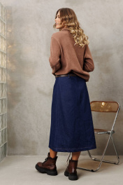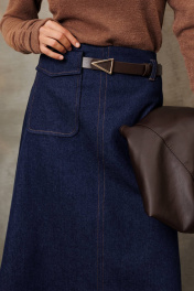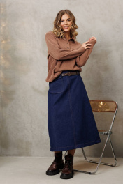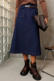Костюм сотоит из джемпеера и юбки. Джемпер прямого силуэта с воротником поло из теплого трикотажного полотна. Рукав втачной одношовный. Юбка А-образного силуэта из плотного джинса. Передняя часть юбки со средним швом. С правой стороны вверху настрочен карман с клапаном- шлевкой. Задняя часть юбки со средним швом и вытачками. Сверху в среднем шве обработана потайная молния. Вдоль линии пояса настрочены шлевки. Пояс цельнокроеный на обтачке. Юбка на подкладке. Вдоль среднего шва по переду и по периметру кармана проложена декоративная строчка. К юбке прилагается сьемный ремень. Фурнитура может быть изменена с охранением художественного замысла. Длина юбки - 78 см, длина джемпера- 66 см, длина рукава - 60 см