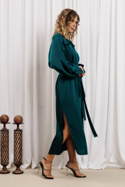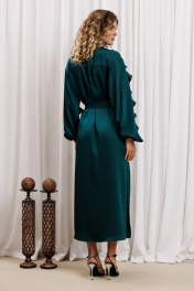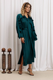 Платье свободного силуэта из струящейся атласной ткани. Перед и спинка с кокеткой и сборкой. Рукав спущенный свободный с резинкой понизу. Вдоль линии кокетки и рукава вставлена рюша. Горловина V-образной формы с воротником стойкой переходящей в бант. В боковом шве разрез. К платью прилагается пояс из основной ткани. Длина платья - 127 см, длина рукава - 60 см.