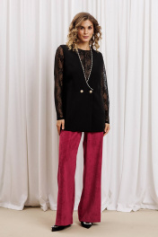 Костюм состоит из блузки и брюк. Блузка приталенного силуэта из кружевной сетки. Перед и спинка с рельефами и средним швом. Рукав втачной. Перед и спинка на телесной подкладке. Длина джемпера - см, длина рукава джемпера - см. Брюки палаццо с притачным поясом из мягкой вельветовой ткани. Спереди застежка гульфик на молнии и петлей и пуговицей по поясу. По задней частям брюк вытачки. Пояс с резинкой в боковых частях. Брюки с заутюженными стрелками. Длина брюк с учетом пояса - 109 см.