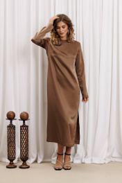 Платье прямого силуэта выполнено из атласной ткани. Перед с нагрудной вытачкой. Спинка с застежкой "капелькой" на петлю и пуговицу сверху. В боковом шве разрез. Рукав втачной одношовный. К платью прилагается пояс из основной ткани. Длина платья 125 см, длина рукава - 61 см.