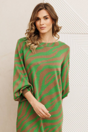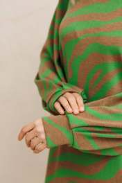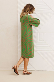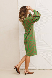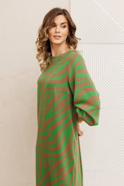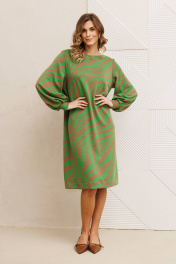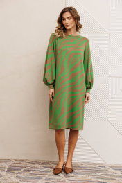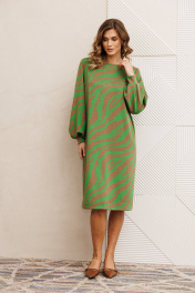 Платье прямого силуэта из плотного трикотажного полотна. Перед с нагрудными вытачками. Спинка со средним швом. Горловина лодочкой обработана планкой. Рукав одношовный втачной по низу со складками собранными на манжету-довяз. Длина платья-100см, длина рукава-60см.