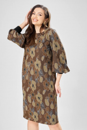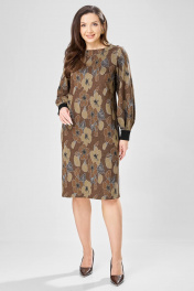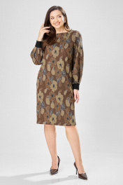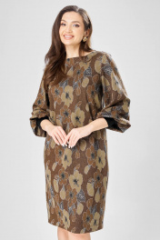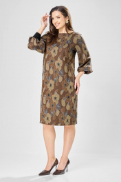 Платье прямого силуэта из плотного трикотажного полотна с рисунком и с люрексом. Перед с нагрудными вытачками. Спинка со средним швом. Горловина лодочкой обработана планкой. Рукав одношовный втачной по низу со складками собранными на манжету-довяз. Длина платья-100см, длина рукава-60см.