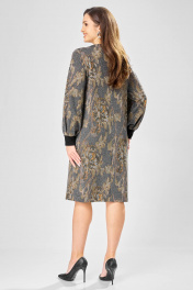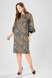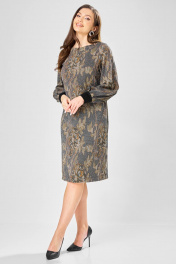 Платье прямого силуэта из плотного трикотажного полотна с рисунком и с люрексом. Перед с нагрудными вытачками. Спинка со средним швом. Горловина лодочкой обработана планкой. Рукав одношовный втачной по низу со складками собранными на манжету-довяз. Длина платья-100см, длина рукава-60см.