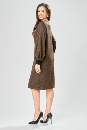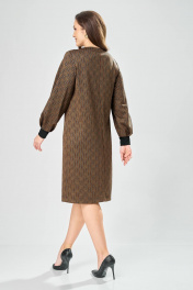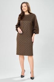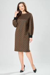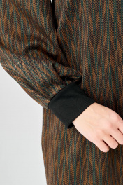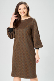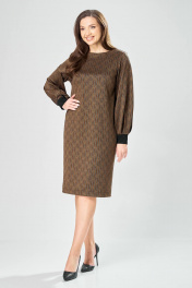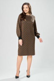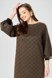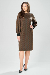 Платье прямого силуэта из плотного трикотажного полотна с рисунком и с люрексом. Перед с нагрудными вытачками. Спинка со средним швом. Горловина лодочкой обработана планкой. Рукав одношовный втачной по низу со складками собранными на манжету-довяз. Длина платья-100см, длина рукава-60см.