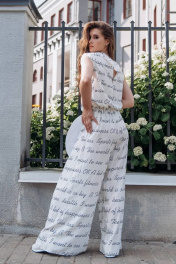 Комбинезон из вискозы прямого кроя. Комбинезон отрезной на приспущенной линии талии с кулиской. Пройма слегка спущена, по лифу переда нагрудные вытачки. По переду брюк глубокий запах, имитирующий разрез. Застежка в среднем шве спинки на две петли навесных и две пуговицы. Цвет белый с черными буквами. Длина изделия р.42-44 - 143 см, р.46-50 - 144 см, р.52-56 - 145см